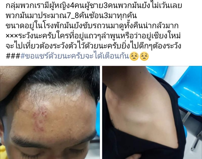 วันนี้ Admin ได้รับแจ้งเหตุ จากผู้เสียหายเป็นวัยรุ่นกลุ่มหนึ่ง เป็นผู้ชาย 3คน ผู้หญิง 4คน มาเที่ยวงานเทศกาลโคมในตัวเมืองลำพูน จากนั้นเมื่อเวลาประมาณตี 1 กว่าๆได้ขี่รถจักรยานยนต์สวนทางกับกลุ่มวัยรุ่นกลุ่มใหญ่ ซึ่งมีรถจักรยานยนต์ประมาณ 7-8 คัน ทุกคันซ้อน 3 กลุ่มวัยรุ่นกลุ่มนี้ได้วนรถกลับมารุมทำร้ายกลุ่มผู้เสียหายได้รับบาดเจ็บ จึงได้เข้าไปยังสถานีตำรวจภูธร อำเภอเมือง ลำพูน