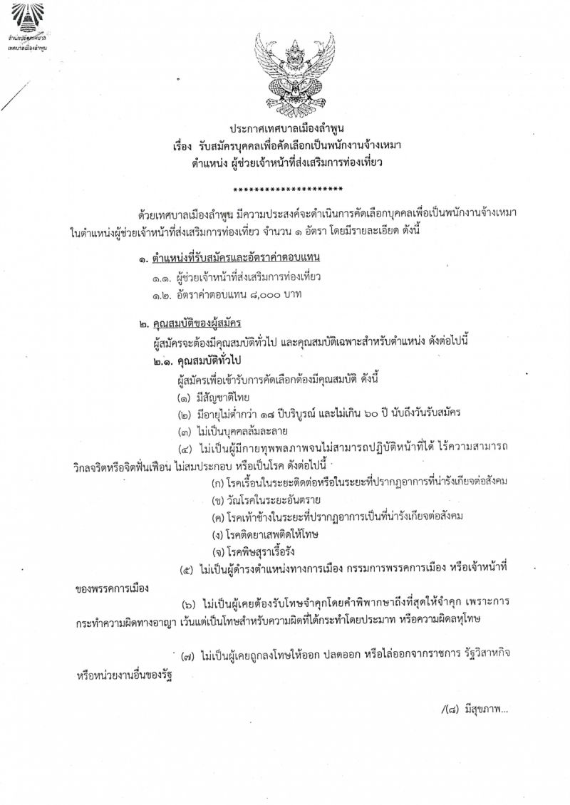 เทศบาลเมืองลำพูน ประกาศรับสมัครบุคคลเพื่อคัดเลือกเป็นพนักงานจ้างเหมา ตำแหน่ง ผู้ช่วยเจ้าหน้าที่ส่งเสริมการท่องเที่ยว จำนวน 1 อัตรา เปิดรับสมัครตั้งแต่วันที่ 8 -19 ตุลาคม 2561 สอบถามรายละเอียด ได้ที่ หมายเลขโทรศัพท์ 053-511013 ต่อ 113 (ในวันและเวลาราชการ)