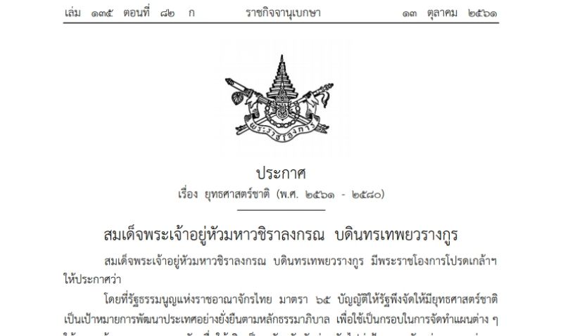 ราชกิจจานุเบกษา เผยแพร่ประกาศพระราชโองการโปรดเกล้าฯ เรื่องยุทธศาสตร์ชาติ ( พ.ศ.2561 -2580 )
