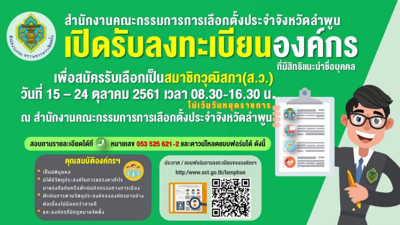 กกต.ลำพูน  โดยนายนพดล สุยะ ผอ.สนง.กกต.จว.ลำพูน  ขอประชาสัมพันธ์ การเปิดลงทะเบียนองค์กรที่จะเสนอชื่อ ส.ว. ตั้งแต่วันนี้ - วันที่ 24 ตุลาคม 2561 เวลา 08:30- 16:30 น. ไม่เว้นวันหยุดราชการ ณ สำนักงานคณะกรรมการการเลือกตั้งประจำจังหวัดลำพูน