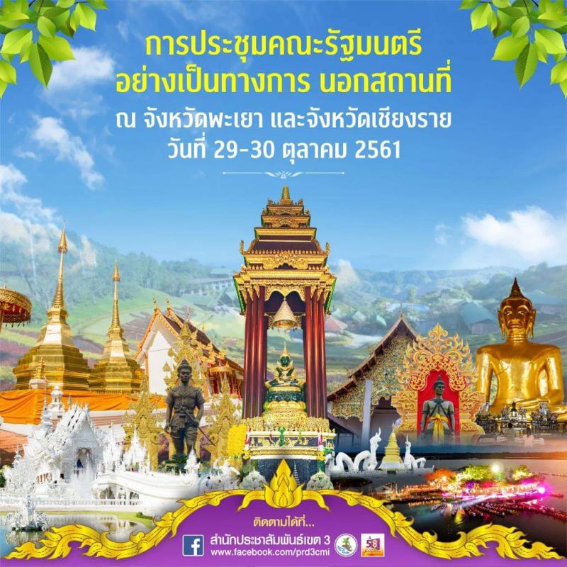 ติดตามความเคลื่อนไหว การประชุมคณะรัฐมนตรีอย่างเป็นทางการ นอกสถานที่ (ครม.สัญจร) ครั้งที่ 8/2561 ณ จังหวัดพะเยา และ เชียงราย ระหว่างวันที่ 29 - 30 ตุลาคม 2561 ทางเพจสำนักประชาสัมพันธ์เขต 3 https://www.facebook.com/prd3cmi/
