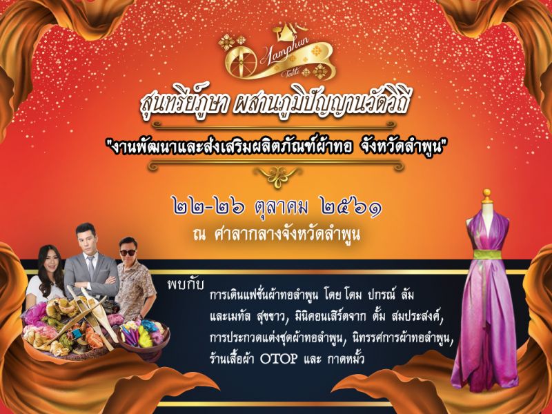จังหวัดลำพูนและสำนักงานพัฒนาชุมชน ขอเชิญชวนร่วมงาน "สุนทรีย์ภูษา ผสานภูมิปัญญานวัตวิถี" ระหว่างวันที่ 22 - 26 ตุลาคม 2561 ร่วมชมการแสดงแฟชั่นโชว์จาก โดม ปกรณ์ ลัม และเมทัล สุขขาว ชมมินิคอนเสิร์ตจาก ตั้ม สมประสงค์ การประกวดแต่งชุดผ้าทอลำพูน โดยน้องๆ นักเรียน ในจังหวัดลำพูน กิจกรรมสาธิตและการฝึกอบรมออกแบบเสื้อผ้า อีกทั้งยังมีชุดผ้าทอลำพูนที่หลากหลายให้ได้เลือกช็อป มีกาดหมั้วให้ได้เลือกชิม มีกิจกรรมสนุกๆ ให้ชมกันทั้งวัน ตั้งแต่เวาลา 10.00 น. - 21.00 น. ณ ศาลากลางจังหวัดลำพูน