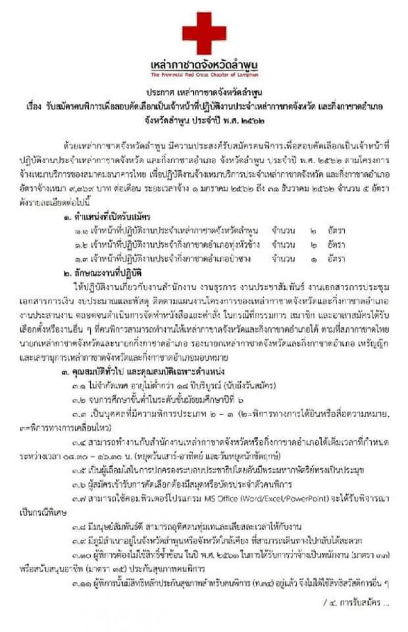ด้วยเหล่ากาชาดจังหวัดลำพูน มีความประสงค์รับสมัครคนพิการ เพื่อสอบคัดเลือกเป็นเจ้าหน้าที่ปฏิบัติงานประจำเหล่ากาชาดจังหวัดและกิ่งกาชาดอำเภอ จังหวัดลำพูน ประจำปี พ.ศ.2562 อัตราจ้างเหมา 9,369 บาทต่อเดือน ระยะเวลาจ้าง 1 มกราคม 2562 ถึง 31 ธันวาคม 2562 จำนวน 5 อัตรา ดังนี้