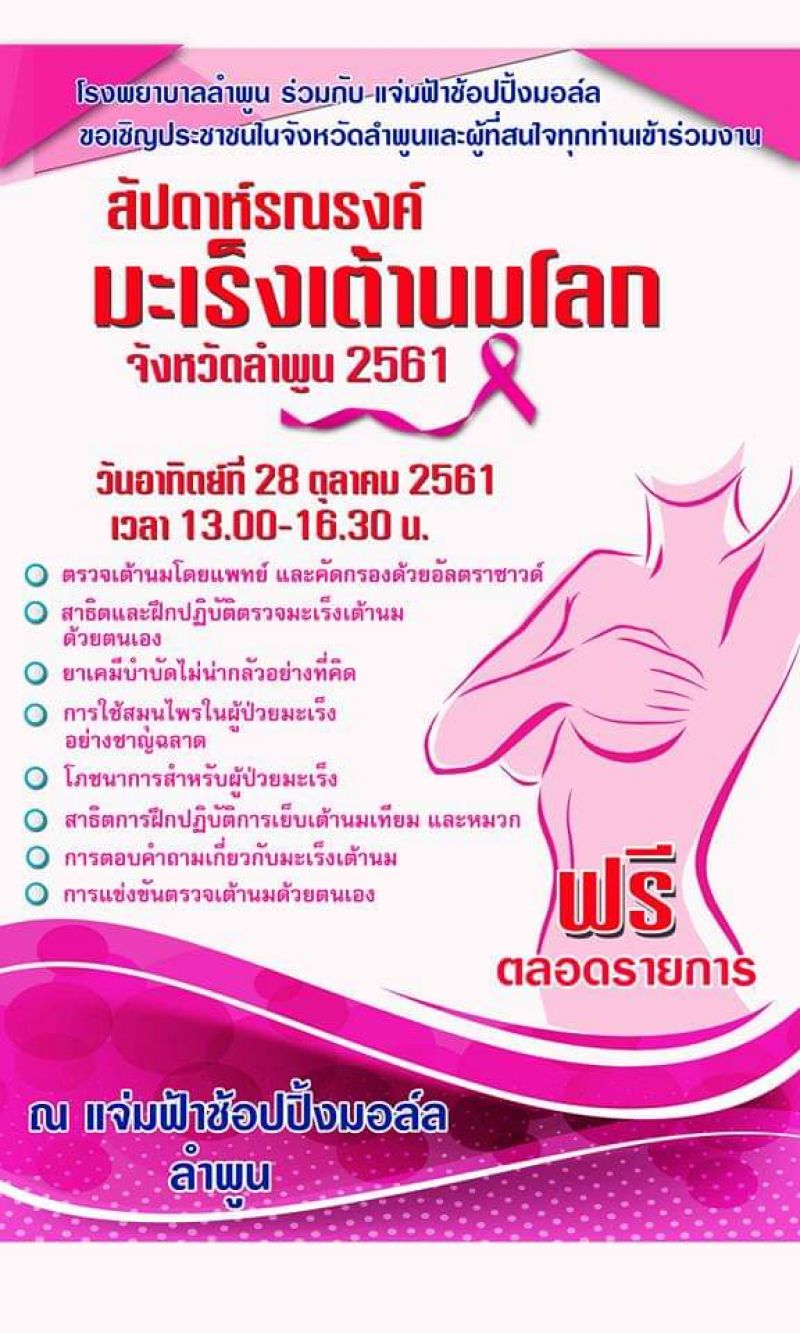 ขอเชิญชวนประชาชนชาวจังหวัดลำพูนทุกท่าน ร่วมกิจกรรมสัปดาห์รณรงค์มะเร็งเต้านมโลก ประจำปี 2561 ในวันอาทิตย์ที่ 28 ตุลาคม 2561 ณ ห้างสรรพสินค้าแจ่มฟ้าช้อปปิ้งมอลล์...#ฟรีตลอดรายการ แล้วพบกันนะคะ