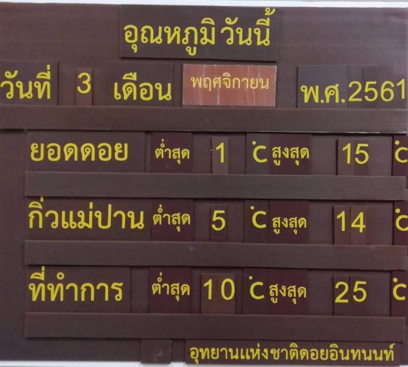 3 พ.ย.61 อินทนนท์หนาวจัด เกิดปรากฏการณ์น้ำค้างแข็งบนยอดหญ้าหรือแม่คะนิ้งหรือเหมยขาบ บริเวณหน่วยพิทักษ์ยอดดอยอินทนนท์ ซึ่งเป็นวันที่สองของหนาวนี้ โดยยอดดอยอินทนนท์ อุณหภูมิต่ำสุด 1องศา และที่กิ่วแม่ปานอุณหภูมิต่ำสุด 5 องศา ## เครดิตข่าว จอมทอง สร้างสรรค์
