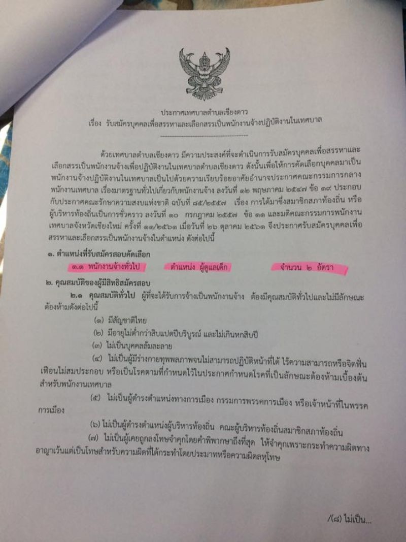 เทศบาลตำบลเชียงดาวรับสมัครสอบคัดเลือกพนักงานจ้างทั่วไปตำแหน่งผู้ดูแลเด็กจำนวน2อัตรา