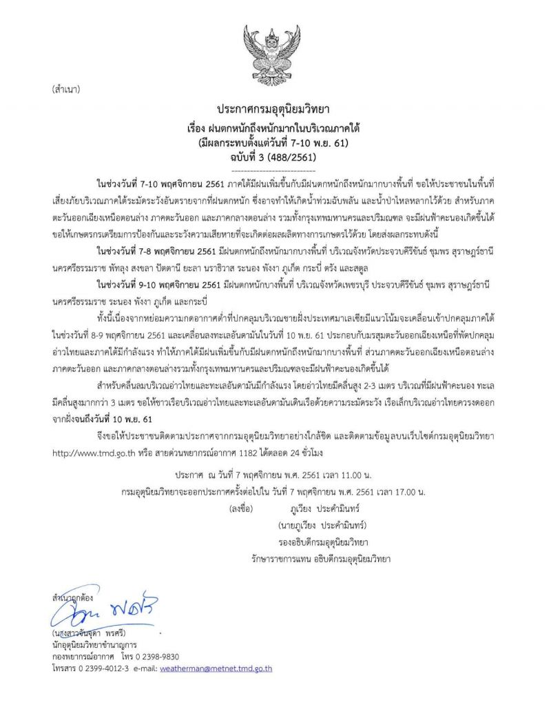 กรมอุตุนิยมวิทยาจะออกประกาศครั้งต่อไปใน วันที่ 7 พฤศจิกายน พ.ศ. 2561 เวลา 17.00 น.