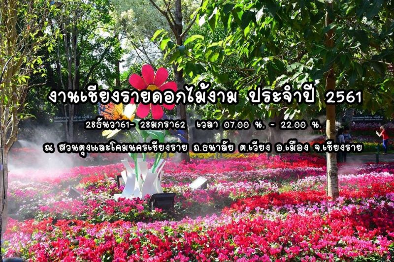 งานเชียงรายดอกไม้งาม ประจำปี 2561 กำหนดจัดงานระหว่างวันที่ 28 ธันวาคม 2561- 28 มกราคม 2562 ชมความสวยงามของไม้ดอกเมืองหนาว หลายสายพันธุ์ เช่น ดอกทิวลิป ดอกลิลลี่ กิจกรรมดนตรีในสวน ทุกวันเสาร์ เริ่มเสาร์ที่ 29 ธันวาคม 2561 - เสาร์ที่ 16 กุมภาพันธ์ 2562   ณ สวนตุงและโคมนครเชียงราย ถ.ธนาลัย ต.เวียง อ.เมือง จ.เชียงราย เปิดให้เข้าชมทุกวัน เวลา 07.00 น. - 22.00 น.