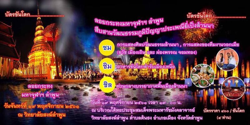 | • 19พ.ย. แอ่วงานลอยกระทง มหาจุฬาฯ ลำพูน ขันโตกเติมไม่อั้น ชมการแสดงล้านนา บัต400฿/4คน |