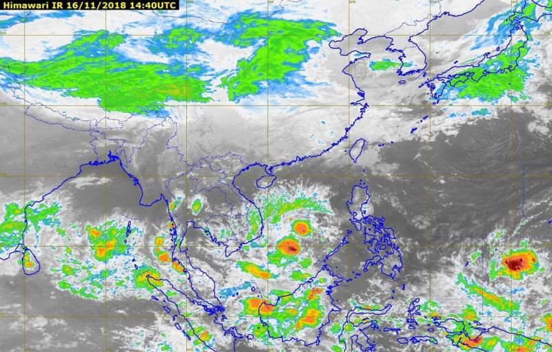 รายงานการติดตามสภาวะอากาศเมื่อเวลา 22.00 น. (วันศุกร์ที่ 16 พฤศจิกายน พ.ศ. 2561) ภาคเหนือ : มีเมฆเป็นส่วนมาก ส่วนใหญ่เป็นเมฆชั้นต่ำ และเมฆฝนฟ้าคะนอง ตรวจพบกลุ่มฝนบริเวณ จ.เชียงใหม่ ลำพูน อุตรดิตถ์ พิษณุโลก พิจิตร และตาก ลมตะวันออกเฉียงใต้ ความเร็ว 10-30 กม./ชม. ติดตามรายงานสภาวะอากาศได้ที่ http://www.sattmet.tmd.go.th/satmet/monitoring/monitoring.html