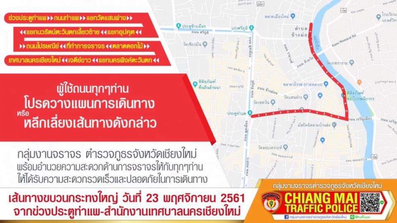 #ประชาสัมพันธ์และฝากแชร์ครับ กลุ่มงานจราจรตำรวจภูธรจังหวัดเชียงใหม่จะมีการปิดการจราจรชั่วคราวงานประเพณียี่เป็งเชียงใหม่ประจำปี 2561 “ขบวนแห่กระทงใหญ่” ในวันศุกร์ที่23 พฤศจิกายน 2561 ช่วงเวลา 15.00-24.00น. ฝากวางแผนการเดินทางหรือหลีกเลี่ยงเส้นทางดังกล่าวด้วยครับ