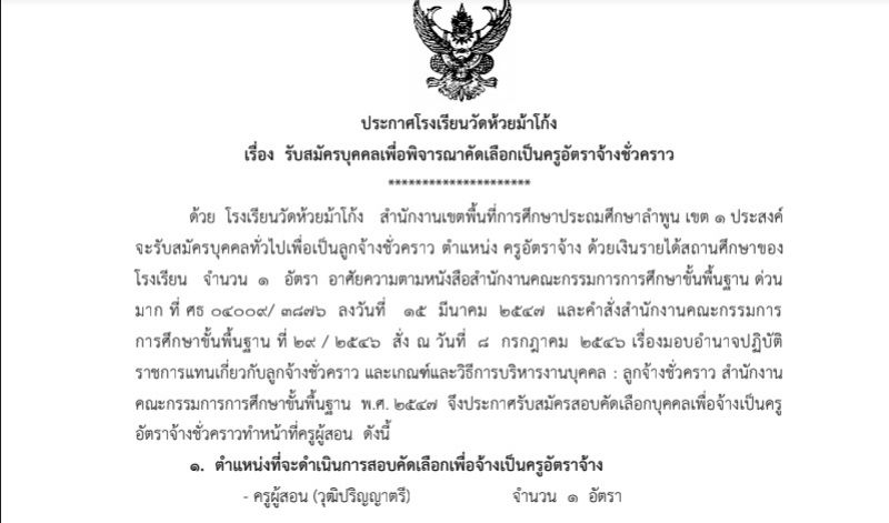 ด่วน! รร.วัดห้วยม้าโก้ง(ลำพูน) รับสมัครครู วุฒิ ป.ตรี เงินเดือน 6,000บาท เริ่มงาน 4ธ.ค.61
