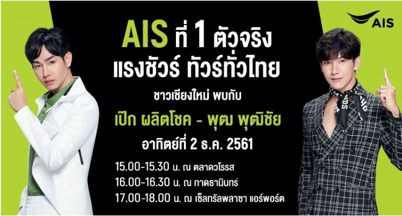 “AIS ที่ 1 ตัวจริง แรงชัวร์ ทัวร์ทัวไทย” เพื่อตอกยำความเป็นที่ 1 ของผู้บริการเครือข่ายโทรศัพย์มือถือ ที่มีคลื่นมากที่สุดในประเทศไทย โดยการนำศิลปิน เป๊ก ผลิตโชค และ ดีเจพุฒ พุฒิชัย มาพบปะกับพี่น้องชาวเชียงใหม่ ในวันที่ 2 ธันวาคม 2561 ตามสถานที่ดังแนบ และ พบกับ MINI Concert จากเป๊กผลิตโชค ที่ลานโปรโมชั่น ชั้น 3 Central Plaza Chiangmai Airport  สโลแกนของแคมเปญ “เอไอเอส ที่ 1 ตัวจริง เร็วแฮงสุด คลื่นนักสุด ทั่วภาคเหนือ”