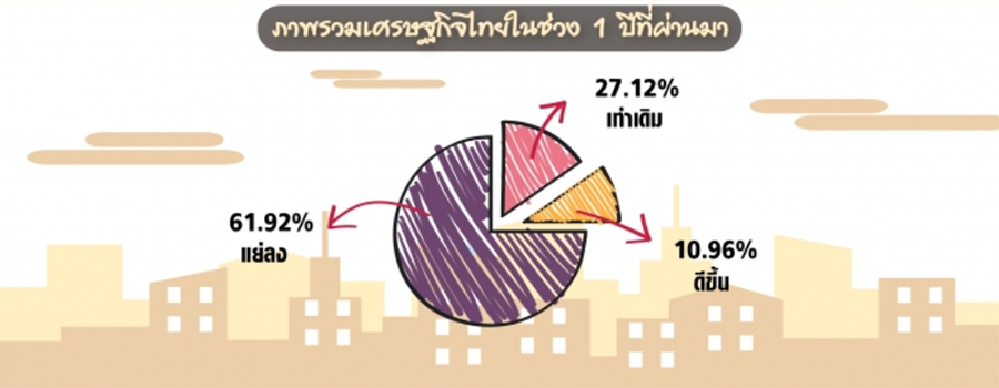 จากการสำรวจเมื่อถามถึงภาพรวมเศรษฐกิจไทยในช่วง 1 ปีที่ผ่านมา ประชาชนส่วนใหญ่ ร้อยละ 61.92 ระบุว่า ภาพรวมเศรษฐกิจแย่ลง รองลงมา ร้อยละ 27.12 ระบุว่า ภาพรวมเศรษฐกิจเท่าเดิม และร้อยละ 10.96 ระบุว่า ภาพรวมเศรษฐกิจดีขึ้น