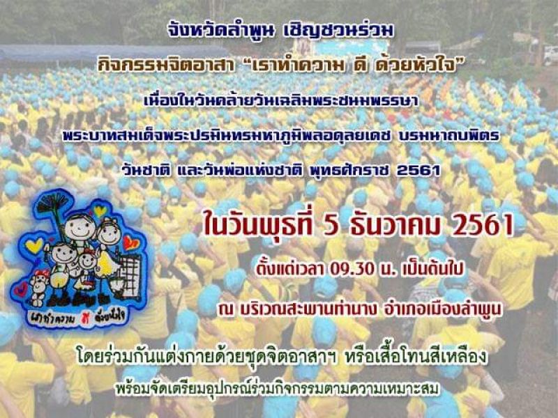 จังหวัดลำพูน เชิญชวนร่วม กิจกรรมจิตอาสา “เราทำความ ดี ด้วยหัวใจ” เนื่องในวันคล้ายวันเฉลิมพระชนมพรรษา พระบาทสมเด็จพระปรมินทรมหาภูมิพลอดุลยเดช บรมนาถบพิตร วันชาติ และวันพ่อแห่งชาติ พุทธศักราช 2561 ในวันที่ 5 ธันวาคม 2561 ตั้งแต่เวลา 09.30 น. เป็นต้นไป ณ บริเวณสะพานท่านาง อำเมืองลำพูน โดยร่วมกันแต่งกายด้วยชุดจิตอาสาฯ หรือเสื้อโทนสีเหลือง พร้อมจัดเตรียมอุปกรณ์ร่วมกิจกรรมตามความเหมาะสม