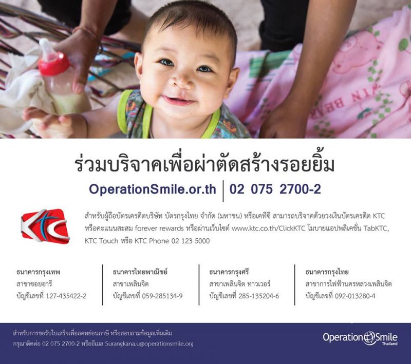 หากต้องการใบเสร็จหรือข้อมูลเพิ่มเติม กรุณาติดต่อ 02 075 2700-2 หรืออีเมล Surangkana.u@operationsmile.org