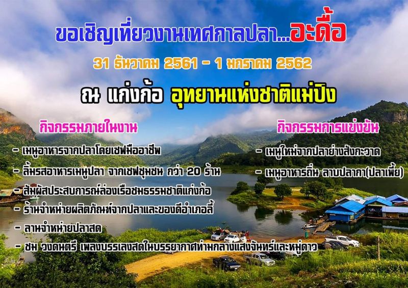 สิ้นปีนี้มาเคาท์ดาวน์ 2019 ณ แก่งก้อ ในงานเทศกาลปลา...อะดื้อ พบการแสดงดนตรีสด น้องอ้อม รัตนัง ชิมเมนูอาหารปลาเลิศรส กว่า 20 ร้านจากเชฟชุมชน พบกัน 31 ธันวาคม 2561 - 1 มกราคม 2562