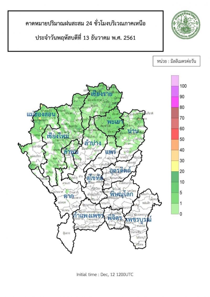 พยากรณ์อากาศและรายงานอา กาศ ประจำวันที่ 13 ธ.ค. 2561 ภาคเหนือยังคงมีฝนตก ฝนฟ้าคะนอง 10 เปอร์เซ็นต์ของพื้นที่ในพื้นที่จังหวัดเชียงใหม่ลำพูนและจะมีอุณหภูมิลดลง 1-2 องศา