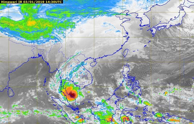 ภาคใต้ : มีเมฆเต็มท้องฟ้า เป็นเมฆชั้นต่ำและเมฆฝนฟ้าคะนอง ตรวจพบกลุ่มฝนบริเวณ จ.ชุมพร ระนอง สุราษฎร์ธานี เกาะสมุย กระบี่ นครศรีธรรมราช ตรัง พัทลุง สงขลา สตูล ยะลา ปัตตานี และนราธิวาส ฝั่งตะวันออก ลมตะวันออกเฉียงเหนือ ความเร็ว 40-60 กม./ชม. ทะเลมีคลื่นสูง 3-5 เมตร บริเวณที่มีฝนฟ้าคะนองคลื่นสูงมากกว่า 5 เมตร ฝั่งตะวันตก ลมตะวันออกเฉียงเหนือ ความเร็ว 20-35 กม./ชม. ทะเลมีคลื่นสูงประมาณ 2 เมตร ห่างฝั่งคลื่นสูงมากกว่า 2 เมตร