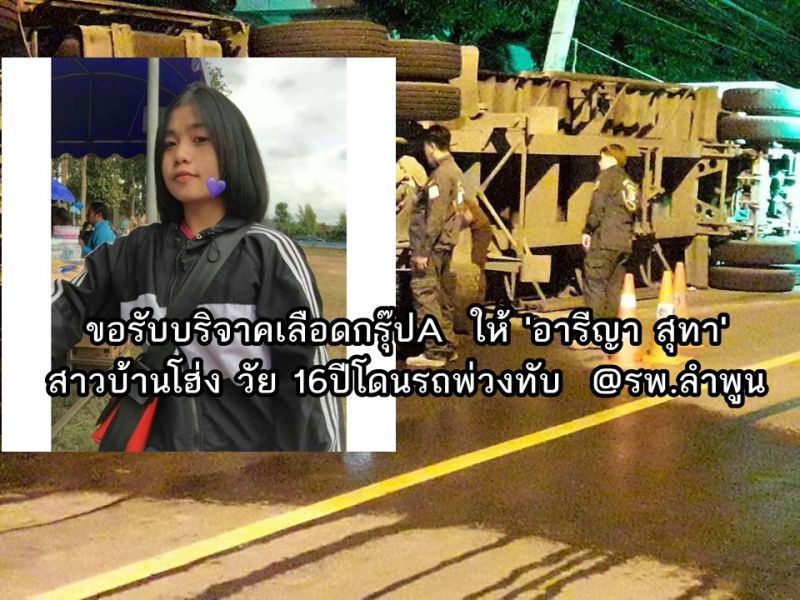 ขอรับบริจาคเลือดกรุ๊ปAหรือO ให้ 'อารีญา สุทา' สาวบ้านโฮ่ง โดนรถพ่วงทับ @รพ.ลำพูน