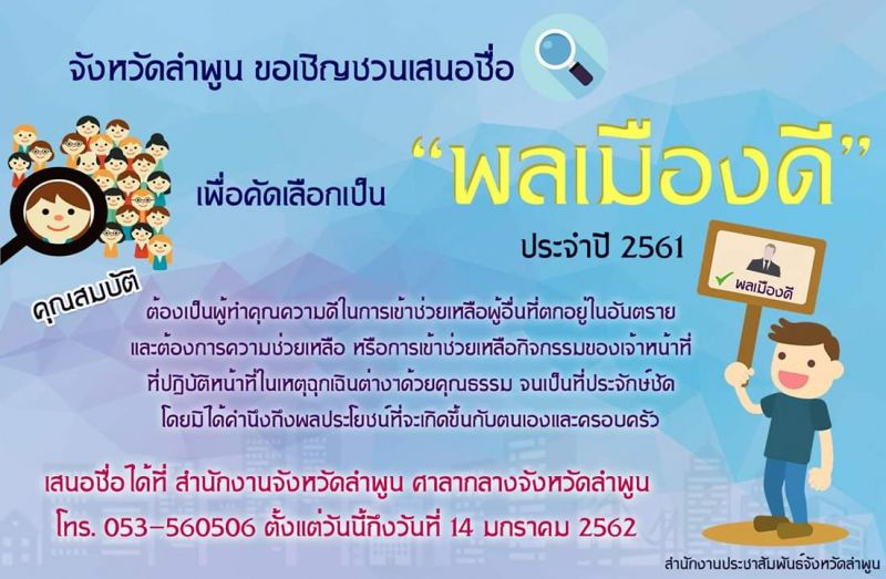 ลำพูนเชิญเสนอชื่อ "พลเมืองดี" โทร.053-560506 ภายใน 14 มค 62