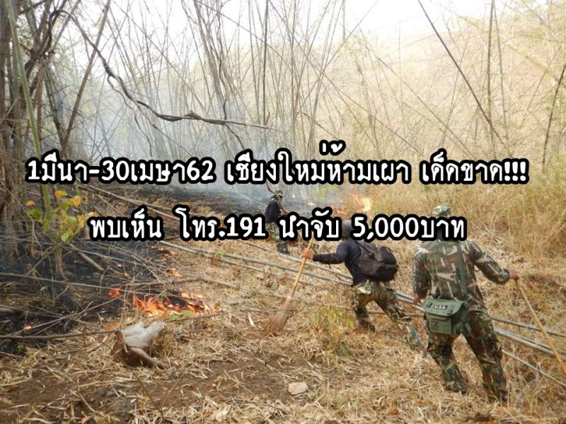 | • 1มีนา-30เมษา62 เชียงใหม่ห้ามเผา เด็ดขาด!!! พบเห็น โทร.191 นำจับ 5,000บาท |
