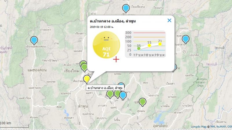 | • ลำพูนค่าฝุ่นควัน PM2.5 สูงสุดในภาคเหนือ มีผลกระทบต่อสุขภาพแล้ว (19ม.ค.62 12.00น.) |
