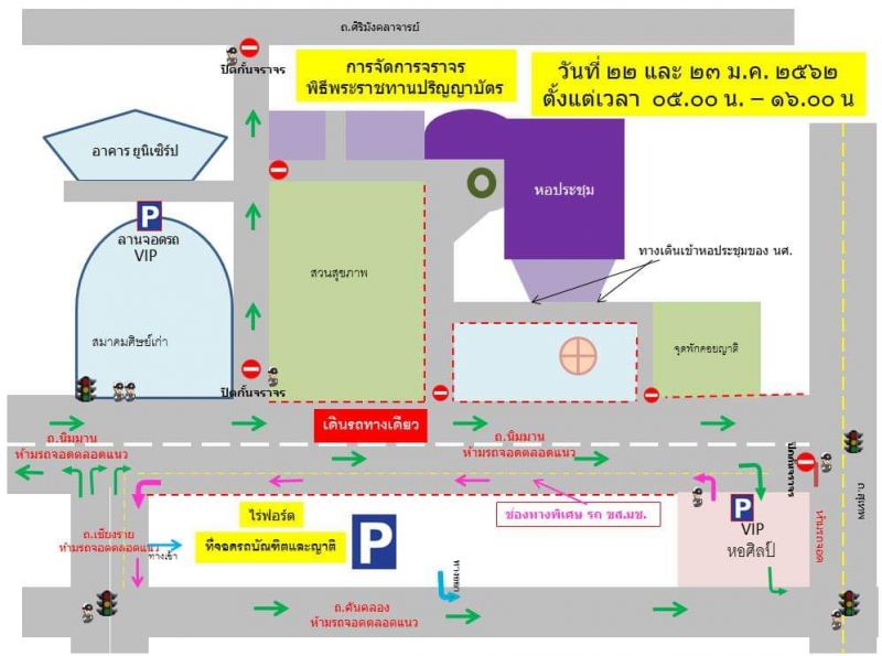 ในวันที่ 22 - 23 มกราคม ตั้งแต่เวลา 05.00 ถึง 16.00 น. จะมีการจัดพิธีพระราชทานปริญญาบัตร มหาวิทยาลัยเชียงใหม่ ้เตรียมวางแผนการเดินทางให้ดี หากไม่จำเป็น กรุณาหลีกเลี่ยงเส้นทางดังกล่าว
