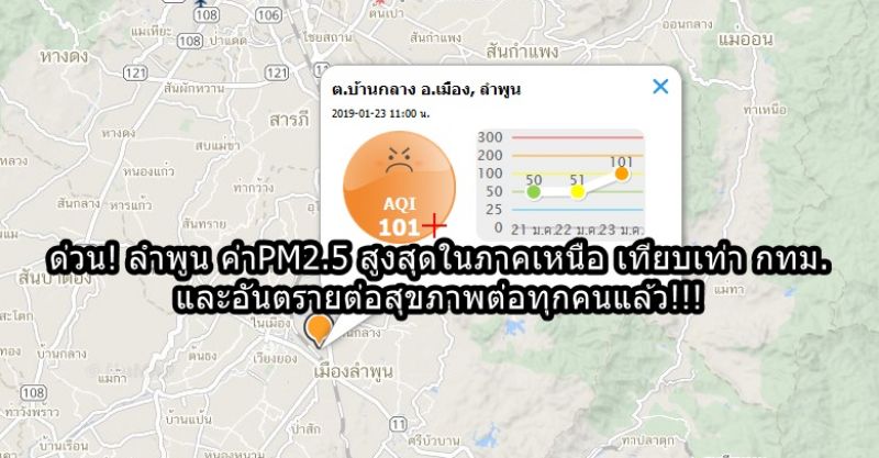 วันนี้ 23 ม.ค. 62 เวลา 11,00น คุณภาพอากาศ ของจังหวัดลำพูน (AQI) ขึ้นสูงไปถึง 101 ซึ่งอยู่ช่วง 101-200 จะเป็นช่วงที่ เริ่มมีผลกระทบ ต่อสุขภาพ ต่อประชาชนทุกคน