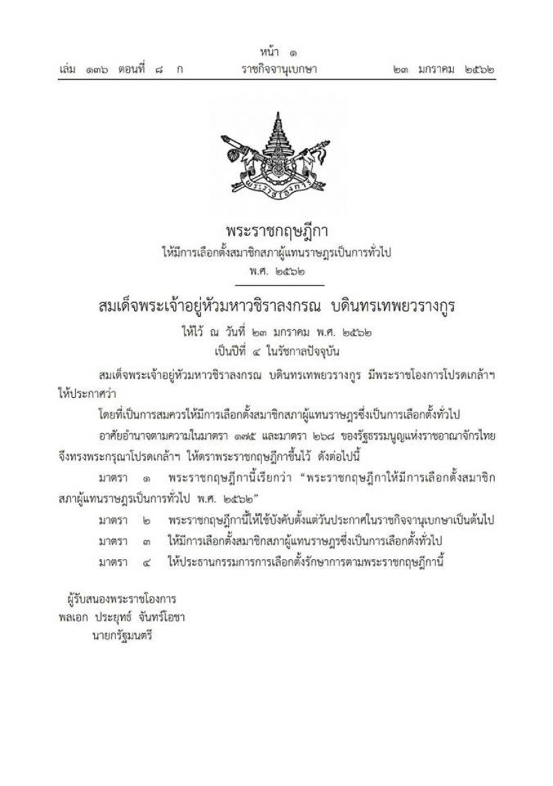 การเลือกตั้ง – วันที่ 23 ม.ค. เว็บไซต์ ราชกิจจานุเบกษา ได้เผยแพร่ ประกาศ พระราชกฤษฎีกาให้มีการเลือกตั้งสมาชิกสภาผู้แทนราษฎรเป็นการทั่วไปพ.ศ. ๒๕๖๒