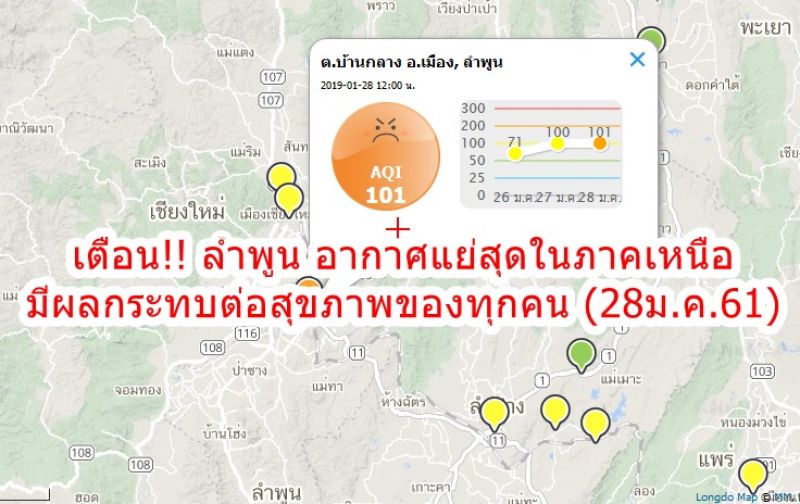 วันนี้ 28 ม.ค. 62 เวลา 12.00น คุณภาพอากาศ ของจังหวัดลำพูน (AQI) ขึ้นสูงไปถึง 101 ซึ่งอยู่ช่วง 101-200 จะเป็นช่วงที่ เริ่มมีผลกระทบ ต่อสุขภาพ ต่อประชาชนทุกคน ส่วนค่าเฉลี่ยน PM2.5 24ชั่วโมง เกินมาตฐานไทย