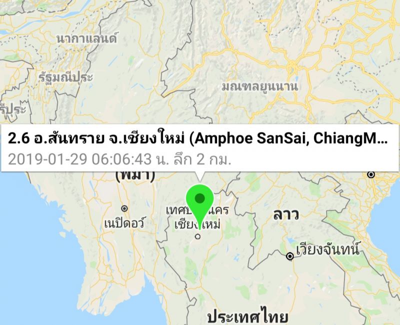 29ม.ค.62 เวลา 06.06น. เกิดแผ่นดินไหว จุดศูนย์กลางที่ อ.สันทราย อ.เชียงใหม่ ขนาด 2.6ริกเตอร์ และได้รับแจ้งจากประขาชนว่าได้รับรู้ถึงแรงสั่นไหว