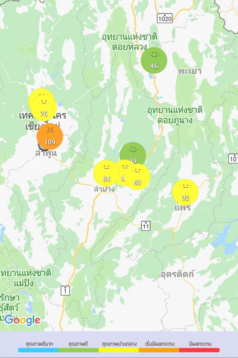 รายงานคุณภาพอากาศของจังหวัดลำพูนเช้านี้ คุณภาพอากาศ โดยวัดจากแอร์โฟร์ไทย อยู่ในเกณฑ์สีส้ม มีค่าอยู่ที่ 109 ซึ่งมากกว่าเมื่อวานนี้ ที่มีค่า อยู่ที่ 101 ( สีส้มหมายถึง ส่งผลกระทบต่อทุกคน) และค่า PM 2.5 เกินมาตรฐาน แล้ว จึงขอแจ้งเตือนพี่น้องประชาชน ลดการ ทำกิจกรรม กลางแจ้ง โดยเฉพาะอย่างยิ่งผู้ที่มีกลุ่มเสี่ยง เช่น ผู้เป็นโรคเกี่ยวกับทางเดินหายใจ
