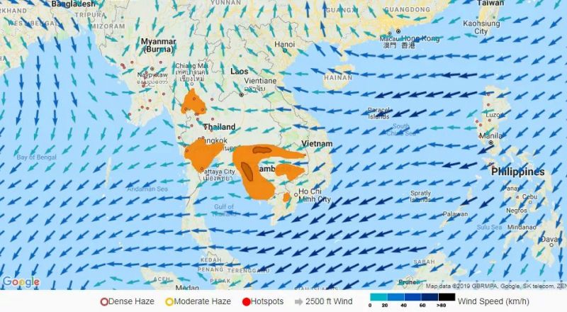 ภาพถ่ายดาวเทียม NOAA วันที่ 29 มค. 62 แสดงกลุ่มหมอกควันจากการเผาในที่โล่งที่พบได้จากจุดความร้อน ซึ่งมีจำนวนหนาแน่นขึ้นในประเทศไทย ในภาคเหนือ และภาคกลาง รวมทั้งจุดความร้อนในประเทศกัมพูชา ซึ่งเป็นสาเหตุหนึ่งของปัญหาหมอกควันข้ามแดน