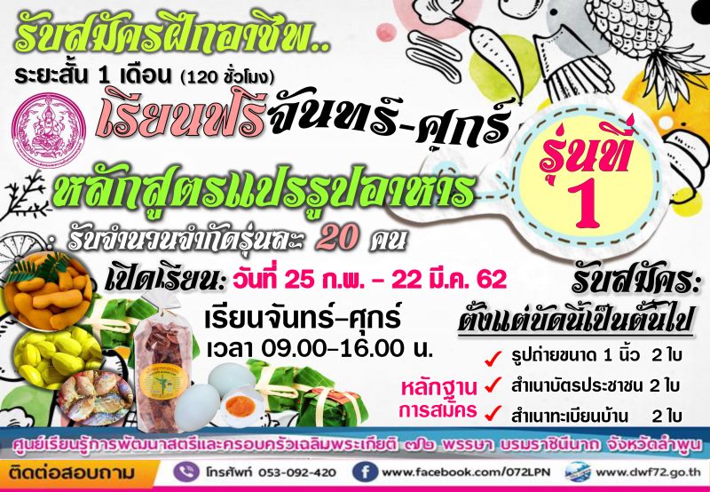 #ฮักการทำอาหารสร้างงานสร้างอาชีพ ต้องมาเรียนฝึกวิชาชีพ "ฟรี" ที่ศูนย์ฯ สตรี 72 พรรษา เน้อเจ้า “หลักสูตรการแปรรูปอาหาร” หลักสูตรระยะสั้น 1 เดือน (120 ชั่วโมง) เรียนจันทร์-ศุกร์ เวลา 09.00 – 16.00 น. สนใจติดต่อสอบถามได้ที่ 053-092-420 ต่อ 24