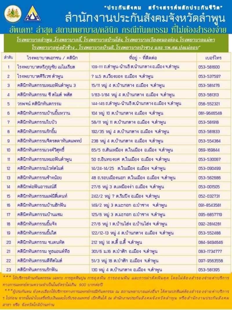 รายชื่อคลินิกทำฟันฟรี ในเขตพื้นที่ จ.ลำพูน (ประกันสังคม)