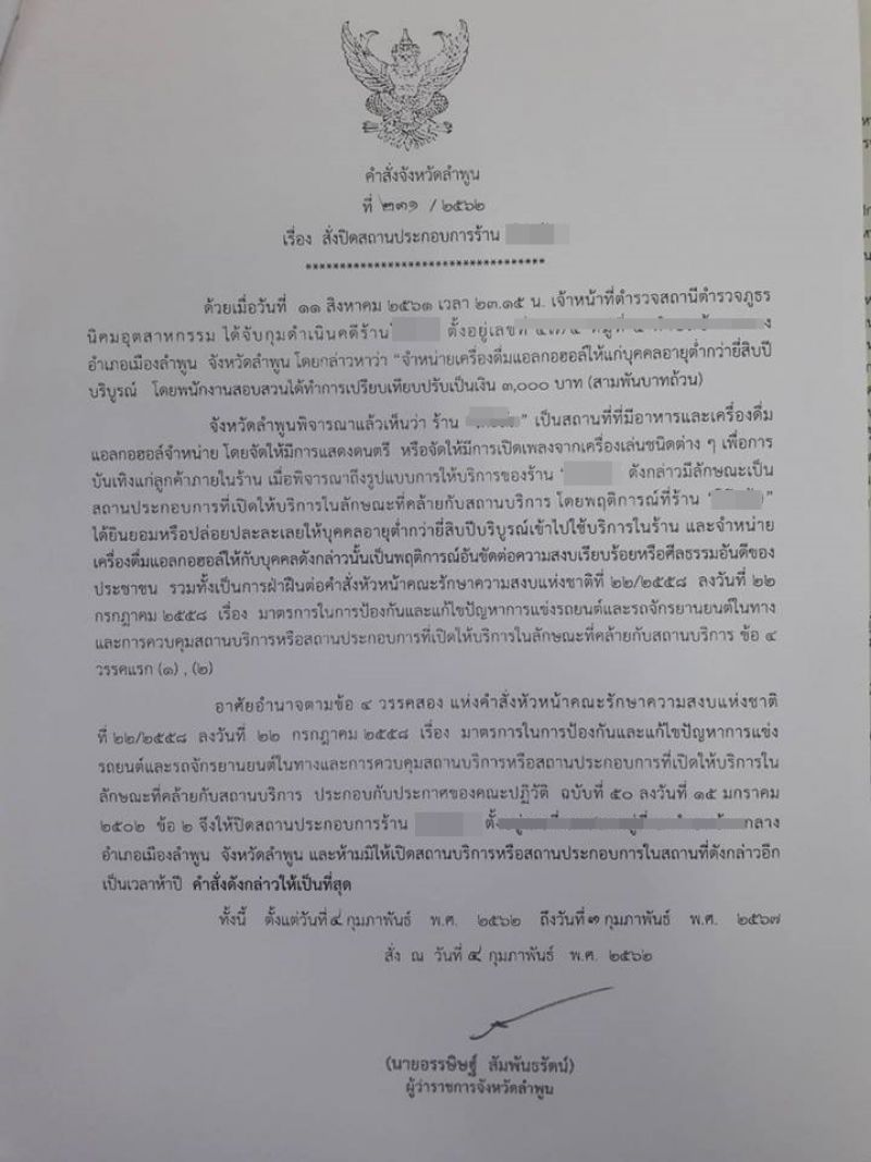 - จังหวัดลำพูน ได้มีคำสั่งปิดสถานประกอบการ แห่งหนึ่งในลำพูน เป็นเวลา 5 ปี ตั้งแต่วันที่ 4 กุมภาันธ์ พ.ศ.2562 - 7กุมภาพันธ์ 2567 เหตุ ขายแอลกอฮอล์ ให้ บุคคล อายุต่ำกว่า 20ปี