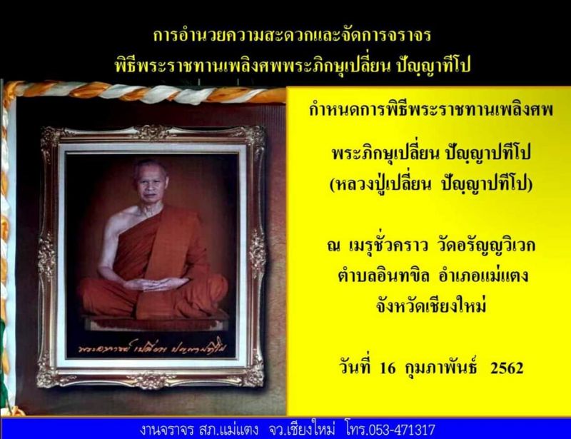 โอกาสนี้ จึงขอเชิญชวนพุทธศาสนิกชนร่วมบำเพ็ญกุศล ถวายภัตตาหาร ออกโรงทาน ฟังพระธรรมเทศนา ฟังสวดพระอภิธรรม และร่วมวางดอกไม้จันทน์ในการพระราชทานเพลิงศพหลวงปู่เปลี่ยนฯ ตั้งแต่วันที่ 14 16 กุมภาพันธ์ 2562 และบำเพ็ญกุศลอัฐิ ในวันที่ 17 กุมภาพันธ์ 2562 ณ วัดอรัญญวิเวก ตำบลอินทขิล อำเภอแม่แตง จังหวัดเชียงใหม่ ในการนี้ ทางวัดร่วมกับจังหวัดเชียงใหม่ คณะสงฆ์จังหวัดเชียงใหม่ และสำนักงานพระพุทธศาสนาจังหวัดเชียงใหม่ พร้อมทั้งคณะศิษยานุศิษย์ ได้จัดเตรียมสถานที่ถวายความสะดวกแด่พระสงฆ์ และอำนวยความสะดวกแก่สาธุชนทุกท่าน โดยคาดว่าจะมีพระสงฆ์และประชาชนมากกว่า 1 หมื่นคน มาร่วมพิธีในระหว่างวันที่ 14 17 กุมภาพันธ์ 2562 นี้