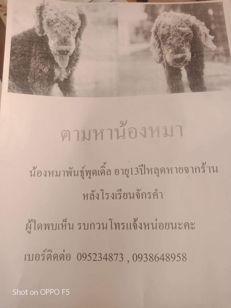 เจ้าของร้านอาหารครัวสองพี่น้อง หลังโรงเรียนจักรคำคณาทร ขอสมาชิกช่วยตามหา หมาชื่อกาฟิวส์ อายุ10ปี ตาบอด หายคืนวันศุกร์ ที่ผ่านมา ที่โรงแรมแท่นทอง1 หลังโรงเรียนจักรคำ