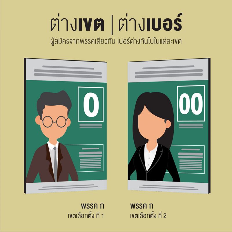 รู้หรือไม่ หมายเลขผู้สมัคร ส.ส. แบบแบ่งเขตเลือกตั้งจากพรรคการเมืองเดียวกัน จะแตกต่างกัน ไปตามเขตเลือกตั้ง ผู้สมัคร ส.ส. จากพรรคเดียวกัน ที่ลงสมัครในแต่ละเขต จะได้หมายเลขไม่ซํ้ากันขึ้นอยู่กับลําดับการสมัครในเขตพื้นที่ ที่ผู้สมัคร ส.ส. ลงสมัคร