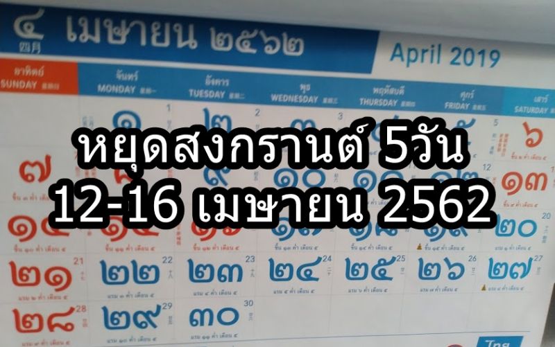 ครม.มีมติเห็นชอบให้วันศุกร์ที่ 12 เมษายน 2562 เป็นวันหยุดราชการเพิ่มเป็นกรณีพิเศษอีก 1 วัน เนื่องในวันสงกรานต์ ทำให้หยุดยาว 5 วัน 12-16 เมษายน 2562