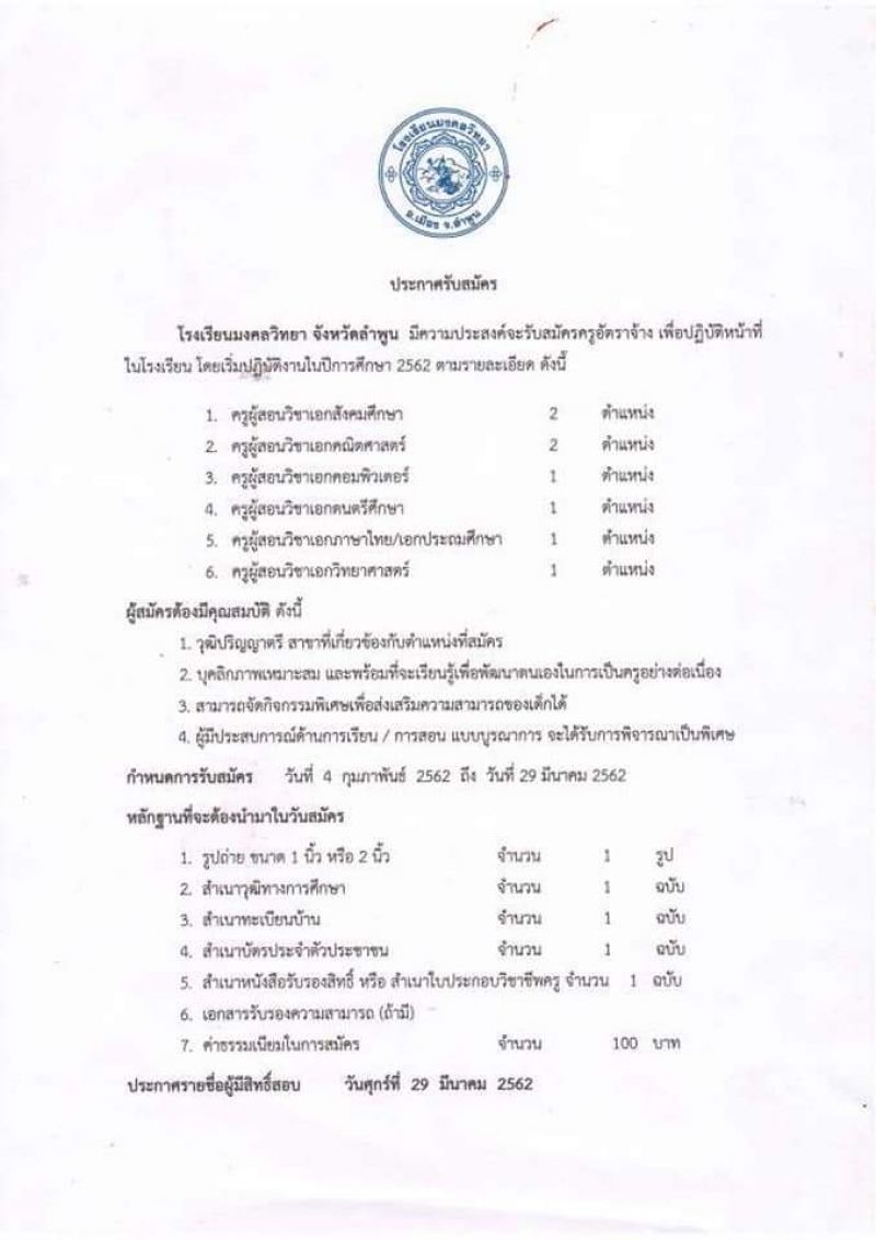 รร.มงคล(ลำพูน) รับสมัครครูหลายอัตรา