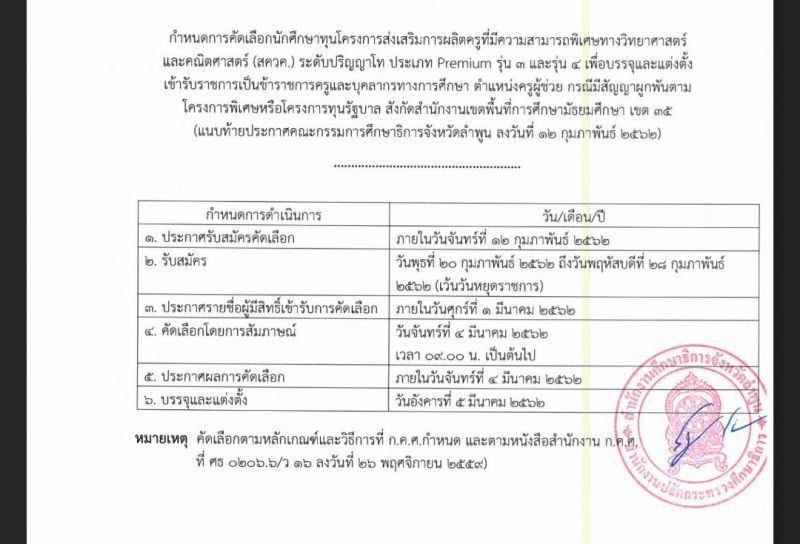 เรื่อง รับสมัครคัดเลือกนักศึกษาทุนโครงการส่งเสริมการผลิตครูที่มีความสามารถพิเศษทางวิทยาศาสตร์และคณิตศาสตร์ (สควค.) ระดับปริญญาโท ประเภท Premium รุ่น 3 และรุ่น 4 เพื่อบรรจุและแต่งตั้งเข้ารับราชการเป็นข้าราชการครูและบุคลากรทางการศึกษา ตำแหน่งครูผู้ช่วย กรณีมีสัญญาผูกพัน ตามโครงการพิเศษหรือโครงการทุนรัฐบาล สังกัดสำนักงานเขตพื้นที่การศึกษามัธยมศึกษา เขต 35
