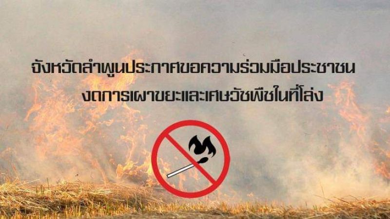 จังหวัดลำพูนประกาศขอความร่วมมือประชาชน งดการเผาขยะและเศษวัชพืชในที่โล่ง เพื่อลดปัญหาหมอกควันไฟป่า และลดปริมาณค่าฝุ่นละอองขนาดเล็ก ( PM 2.5 ) ในพื้นที่จังหวัดลำพูน