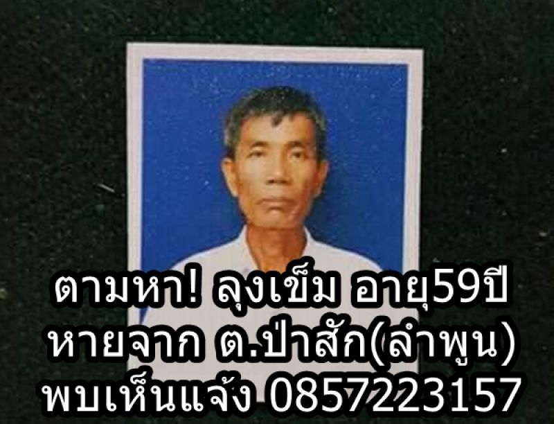 ตามหา! ลุงเข็ม อายุ59ปี หายจาก ต.ป่าสัก(ลำพูน) พบเห็นแจ้ง 0857223157