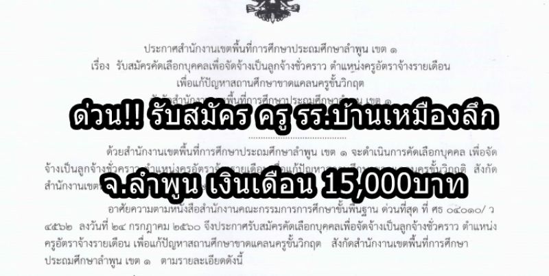 สพป.ลำพูน เขต 1 ประกาศรับสมัครคัดเลือกบุคคลเพื่อจัดจ้างเป็นลูกจ้างชั่วคราว ตำแหน่งครูอัตราจ้างรายเดือนเพื่อแก้ปัญหาสถานศึกษาขาดแคลนครูขั้นวิกฤต กลุ่มวิชาประถมศึกษา โรงเรียนบ้านเหมืองลึก อำเภอแม่ทา จำนวน 1 อัตรา ขอรับใบสมัครและยื่นใบสมัครด้วยตนเองได้ที่กลุ่มบริหารงานบุคคล สพป.ลำพูน เขต 1 ระหว่างวันที่ 28 ก.พ.62 - 6 มี.ค.62 เวลา 08.30-16.30 น. ไม่เว้นวันหยุดราชการ