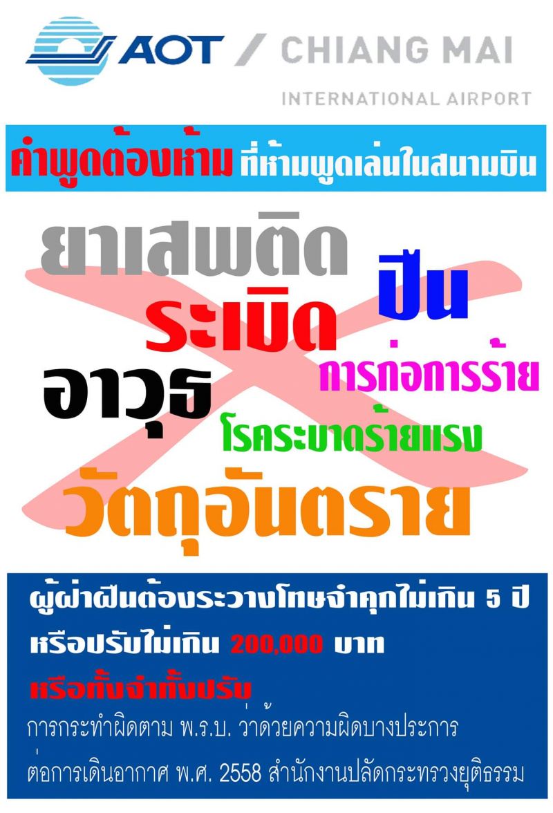 สำหรับผู้โดยสารไปกับสายการบินต่าง ๆ ห้ามพูดเล่นในประโยคเหล่านี้เด็ดขาด ไม่ว่าจะอยู่บนเครื่องบิน หรืออยู่ในสนามบินก็ตาม เช่น การพูดถึงยาเสพติด ปืน ระเบิด อาวุธ วัตถุอันตราย โรคระบาดร้ายแรง การก่อการร้าย คำหยาบคายที่เจ้าหน้าที่พิจารณาว่า เป็นการคุกคาม ก่อความรำคาญ หรืออาจเป็นภัย โดยผู้ฝ่าฝืน มีความผิดตามกฎหมาย ต้องระวางโทษจำคุกไม่เกิน 5 ปี หรือปรับไม่เกิน 200,000 บาท หรือทั้งจำทั้งปรับ