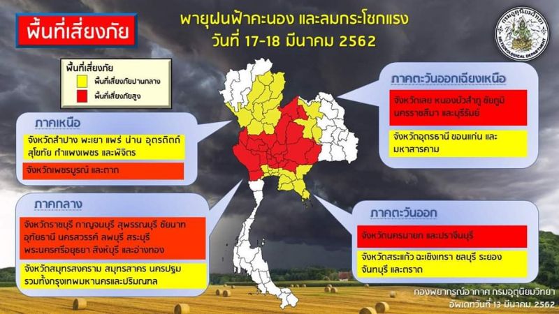 พื้นที่เสี่ยงภัยพายุฝนฟ้าคะนองและลมกระโชกแรง ระหว่างวันที่ 14-18 มีนาคม 2562 /// อัพเดต วันที่ 13 มีนาคม 2562