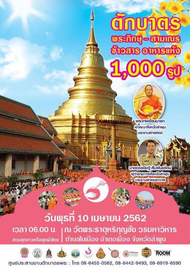 เชิญร่วมตักบาตร สามเณร 1,000 รูป 10เมษา62 @วัดพระธาตุหริภุญชัย ลำพูน
