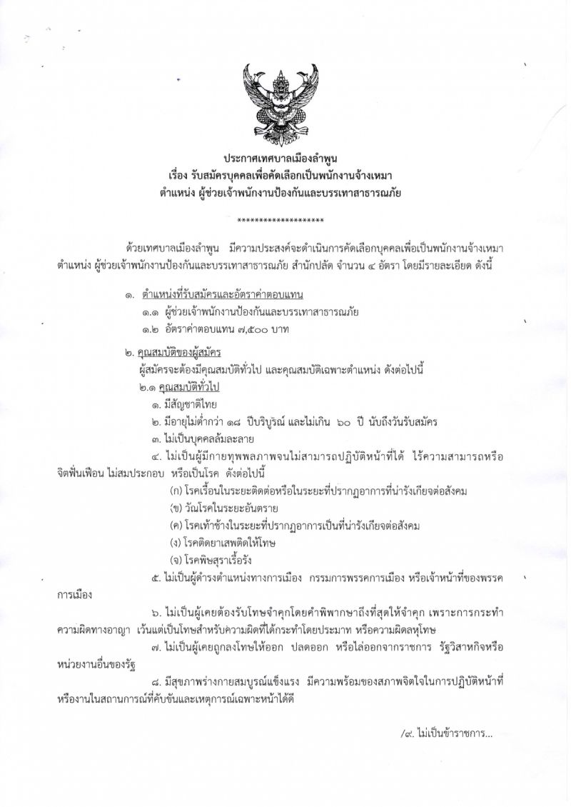 เทศบาลเมืองลำพูน ประกาศรับสมัครบุคคลเพื่อคัดเลือกเป็นพนักงานจ้างเหมา ตำแหน่ง ผู้ช่วยเจ้าพนักงานป้องกันและบรรเทาสาธารณภัย จำนวน 4 อัตรา